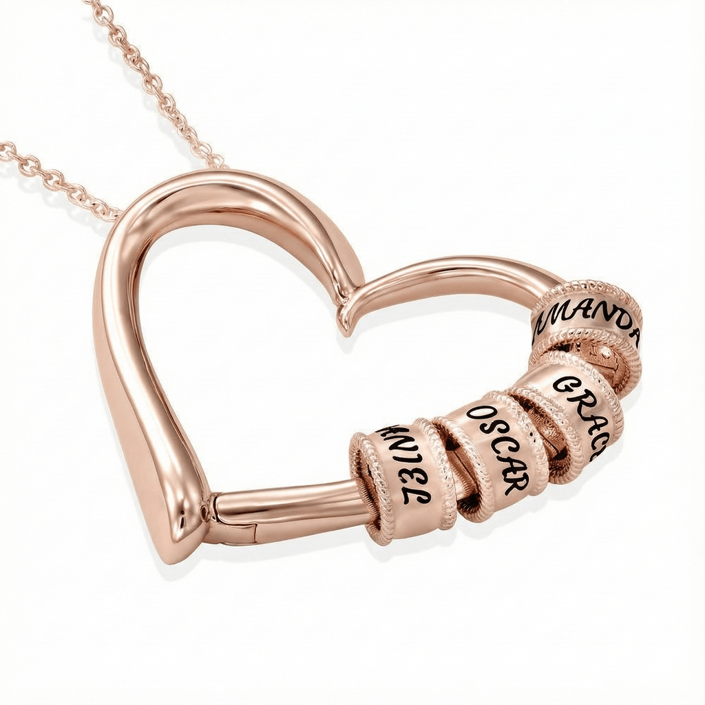 Crafted from high-quality stainless steel, this modern heart pendant holds up to five custom-engraved beads, each representing a name, bond, or cherished memory. Every piece tells a story — your story — worn close to the heart.